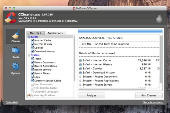 En cuanto a CCleaner, tiene una interfaz de usuario fácil de entender que le permite deshacerse de los archivos temporales ocultos que ya no están siendo utilizados por las aplicaciones de tu Mac. Con la aplicación, todo lo que tienes que hacer es marca de verificación de los elementos que deseas eliminar y hacer clic en Analizar para ver cuánto espacio se ahorrarían al eliminar estos archivos. Si así lo prefieres, haz clic en Ejecutar Limpiador y deja que la aplicación haga su trabajo.